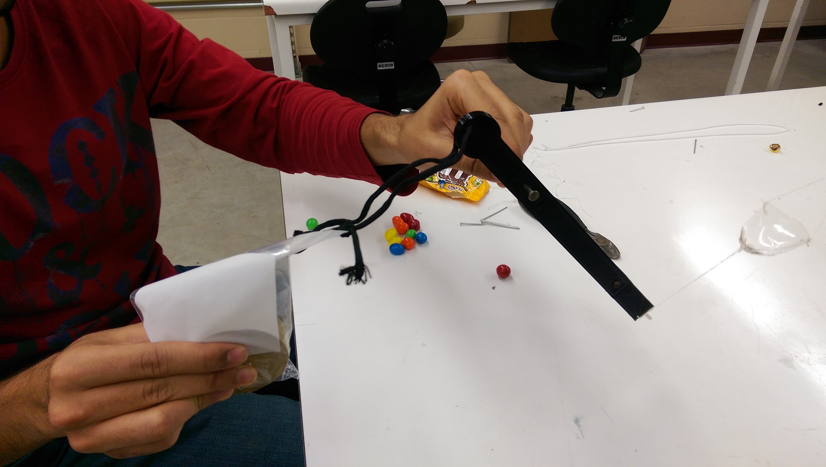 We then began testing throwing M&Ms. First we looked at which arm ratio worked best, and then which finger angle worked best.