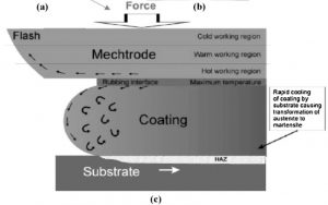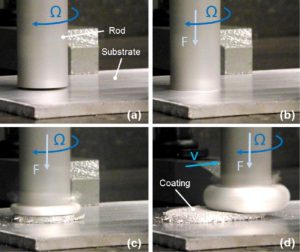 Figure 1 shows the process setup. The rod plunges into the substrate at a high rotational speed (around 2000 RPM). A traverse feed is also provided to the rod, so it moves along the surface of the plate. This causes a layer of the rod material to be deposited on the substrate.