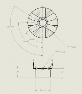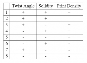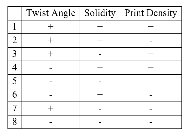 This hub will be machined out of aluminum and mounted to a generator from which the efficiency of each turbine will be determined. The individually printed blades can then be attached to the hub at a variety of angles. Initial experimental plans include alternating the the twist angle, the turbine solidity and the print density between to be determined high and low levels. This will sum up to be 8 variations that are expressed in the following design matrix,