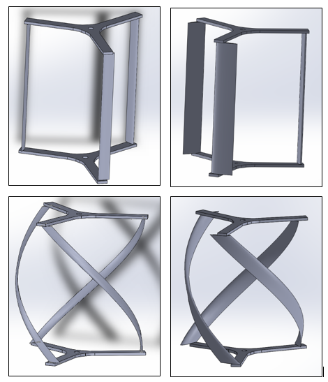 Once the blades were completed a set of center pieces were designed to connect all three of the blades together. This center piece will slide over a rod that will act as an axis for the turbine to revolve around. The assembled version of the four designs can be viewed in Figure 1.