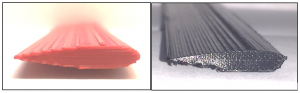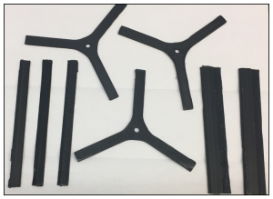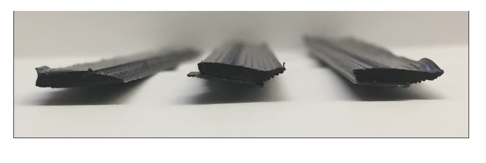 The top surface finish of the ABS was systematically rough due to the 3 times higher layer thickness. As for the PLA parts, the side that was facing up felt smooth to the touch. The bottom side however, from which the support material was removed, turned out chaotically rough. The support material used by the Statasys F370 was QRS which was dissolved off of the parts, removing the risk of ruining the surface finish. Due to the small over all thickness of the parts, this surface roughness had a large affect on the over cross-section of the PLA blades, as well. The effect of this and warpage was again noticeable in the smaller strait blades that were printed in PLA.