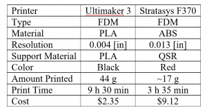 The Ultimaker was used to print a total of 6 parts (Figure 2) and the Statasys F370 was used to print three (Figure 3).