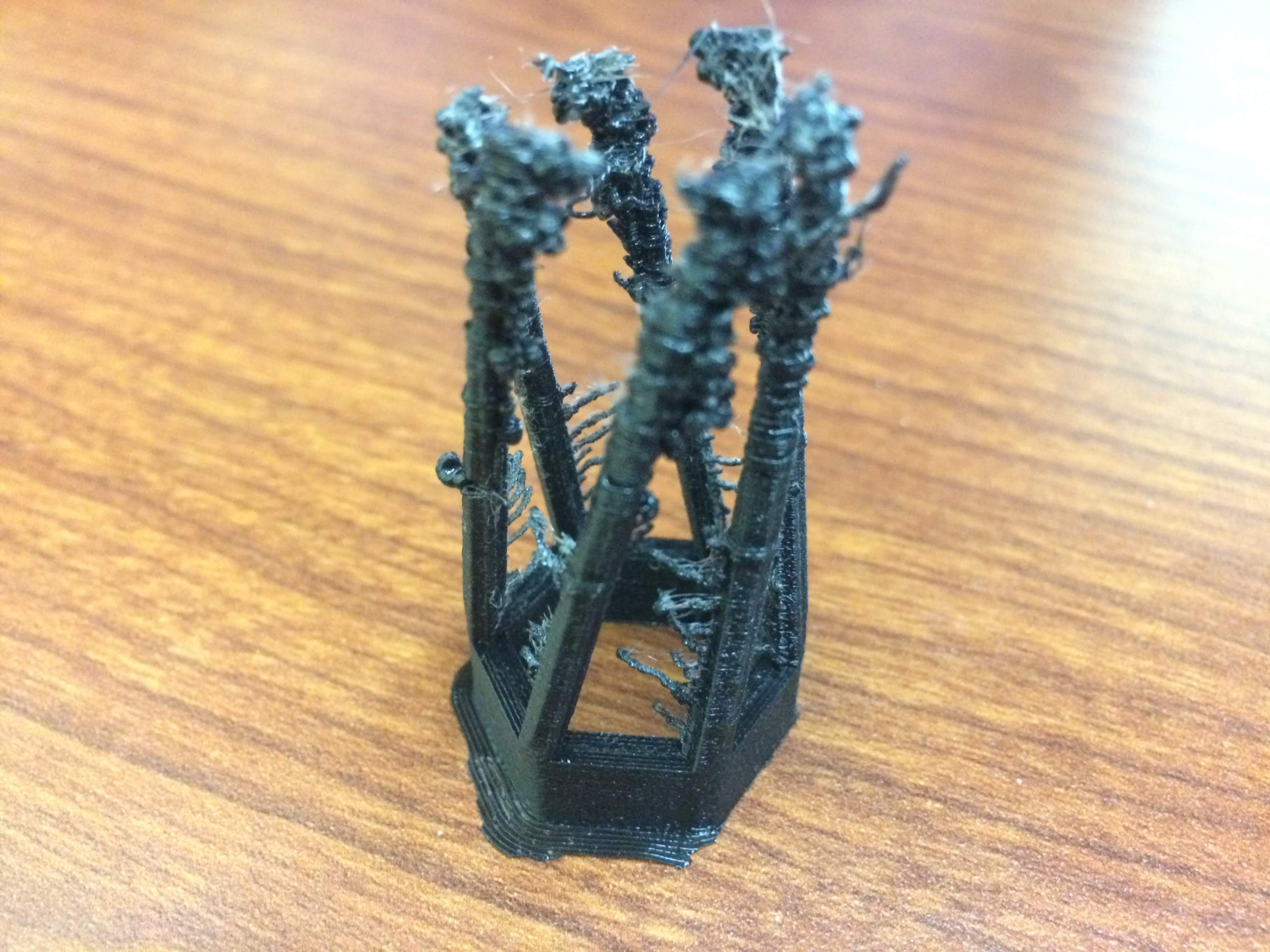Our first trial run of Design1 print failed because the printer head would bump into the part and cause it to be misaligned (ref. Figure 3). We tried printing with tough PLA and the more flexible TPU, which is more ideal for us given that we would like the flashlight to be worn on a finger and still allow for normal movement. TPU failed multiple times for the same reason as above, however, we were able to verify that TPU would be suitable for a wearable device given the part that managed to print before failure. We were able to get the tough PLA to work when slowing the print speed down (ref. Figure 4).