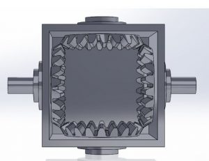 The first design and print was used to test the feasibility of this project. Some conclusions the first print targeted included the ability for the gears to be printed, interlock, and rotate. The design was based off the center of the differential, the two spider gears and two side gears. They were put in a container that allowed for easier printing and spaced to interlock with each other which is shown in Figure 2. The cubic structure the gear structure was built around was specified to be 3.5” in each direction. The spacing between the gear faces and the side wall was kept at 1/16”. The diameter of the gear shafts were 1/16” smaller than the wall holes they were placed in to allow for rotation. The gears used were ISO standard bevel gears, allowing for a 90 degree interface that translated rotation across to the other gears.