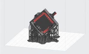 Figure 3 – PreForm sliced gearbox. The red colored structure in the interior of the walls of the gearbox indicated a need for support structure for the print.