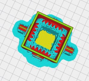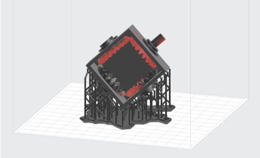 Figure 4 – Cura sliced gearbox. The support structure added around a 30% increase in print time. Although it was necessary, support will be revisited for the next print.