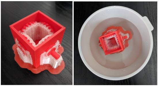 Figure 5 – Finished first printed gearbox (left) and part post processing (right). The gearbox was placed in a warm water bath to remove PVA.