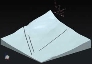 After testing out multiple programs, we found that using NX could be a viable way to edit STL files – although tedious. The next step is deciding how large the details must be in order for them to be useful. We want to add text on top of slopes, without the text covering over the slope terrain details. In that sense, a suitable size and width for the lettering and the slope itself is crucial for our purposes. In Figure 2 below, we have started cutting out a layer of the slopes in preparation for sizing of text.