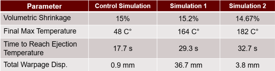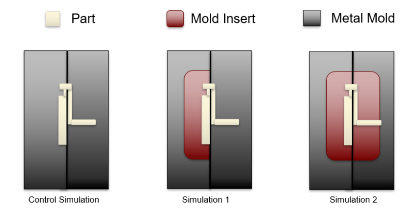 The results, shown below in Table 3 and Figure 6, show that the major problem, which we theorized, was indeed the uneven cooling. The results show that although having two mold inserts increases the time it takes for the part to cool down, the part has better quality. It also shows that the part with the two mold inserts most closely resembles the part with no mold insert. What would be the next step for us in this project, regarding simulations, would be to test out how having the cooling channels run through the mold insert would result in part quality. It is also important to note that the exact properties of the plastic we are using are not known as both Stratasys and PolySpectra do not give exact properties of their materials; therefore the next step would be to contact them and ask if it were possible to obtain the material properties. Otherwise, the inserts will need to be thermally and mechanically characterized.