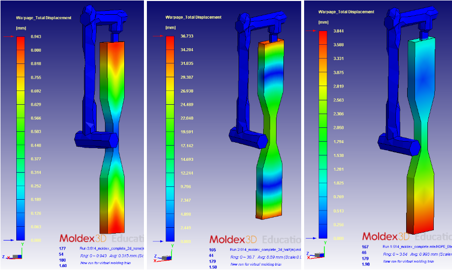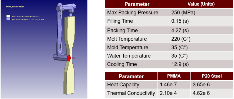 For the initial simulations, a control simulation was used were the entire mold was made out of P20 steel, using the automated parameters Moldex3D. The simulations of the mold insert was then compared to two other simulations; one in which one mold insert covered the part and half of the runner system, and another one having another mold insert covering the rest of the part and runner system; this can be seen from Figure 4. The material properties used for the mold insert were those of ABS, as it resembles the material that we will be receiving from Stratasys and PolySpectra. Table 2 shows the following parameters that were used for all three simulations. It is important to note by Figure 5 that the mesh of the runner system and the part were warped as a result of having the surfaces of the part touching the surfaces of the mold insert. Although this might decrease the accuracy of the results, we are mostly using these simulations to observe the differences between using one mold insert and using two mold inserts, in comparison to having no mold insert at all.