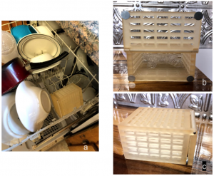 After all of this, the box was put to use in a dishwasher along with two retainers. The cycle was run at “high temp”. After the full cycle was complete, the box was examined for any deformations from the exposure the harsh environment of the dishwasher. The box did not have any visible deformations. It also stayed closed, so the magnetic locks performed successfully, and there was no standing water in the box so the grid system performed as designed. Based on this test, the part was a success.