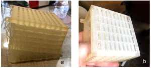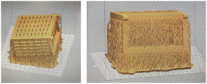 The final box print was successful. It has strong angles and is rigid. The hinge also printed well. The only issue with this print was that some of the grids that didn’t get supports drooped. This shouldn’t affect the functionality or structural rigidity enough to be an issue. There were many supports that needed to be cut and sanded away, so some of the faces are rougher than others.