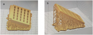 The next step was to slice the door on Preform. Our goal was to have it print in under 2 hours. Initially, the auto-generation tool set the print time to 3 hours and 53 minutes. After changing the orientation, the final print time was 2 hours and 33 minutes. This cut off more than an hour, but not quite enough to be under the 12 hour threshold. After consulting Makerspace staff and the class TA, we concluded this was as close to the 12 hour time we could get. This print unfortunately did not work, as the door printed with some warpage and the hinge rod could not go through the holes, making the door unusable. To avoid warpage, we tried another geometry where the door was kept vertical. While this fixed the issue, it unfortunately increased the print time because the machine had to print at a higher angle. The result was satisfactory and is shown below in Figure 2.