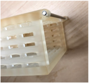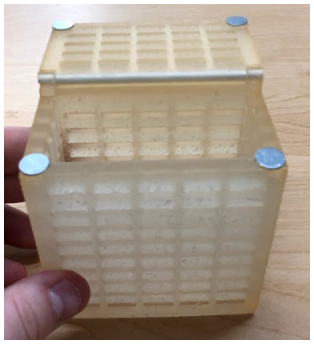 There has been a significant amount of development made since the second project update. First, an improved solidworks file was created that split the original design into two components: the meshed box, and an external door which is connected by a hinge. Additionally, using the Form 2 with High Temp material instead of the Ultimaker greatly improved the print quality of the two pieces compared to the prototype print. For the hinge, a 3 1/2” x 1/8” stainless steel rod was inserted into the printed box. To provide a locking mechanism for the enclosure, we chose to implement two magnets along the top corners of the door. Because there was a small displacement between the box and the door from the hinge, the magnets proved to be a viable solution as they bridged the gap between the two pieces. Lastly, additional post-printing fabrication was performed to fine-tune the design and ensure the best fit for the assembly.