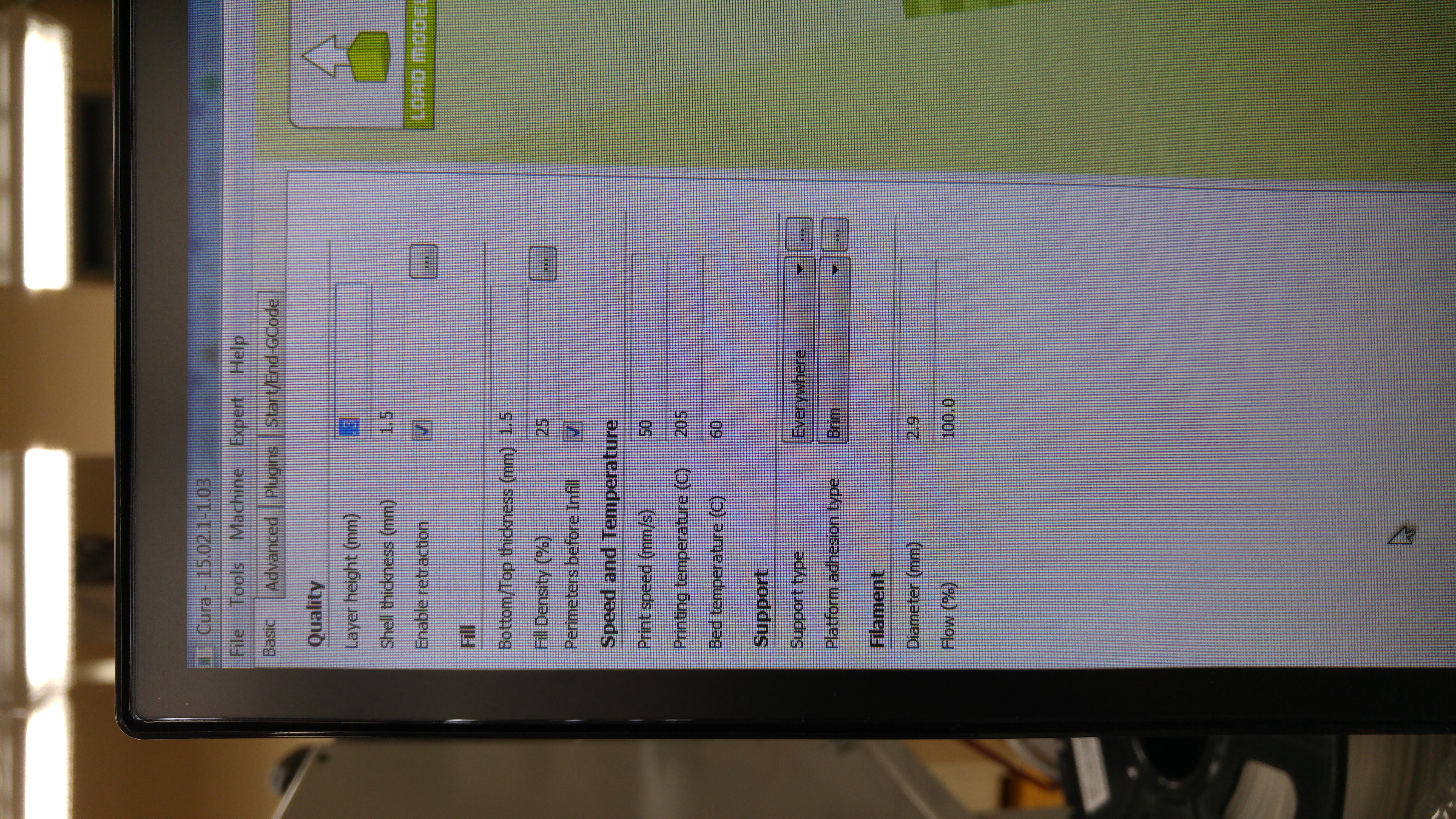 The photo following the designs show the parameters used in Cura during all of our FDM prints. Since strength and finish were not as important for our parts, we chose these parameters to produce a quick print.