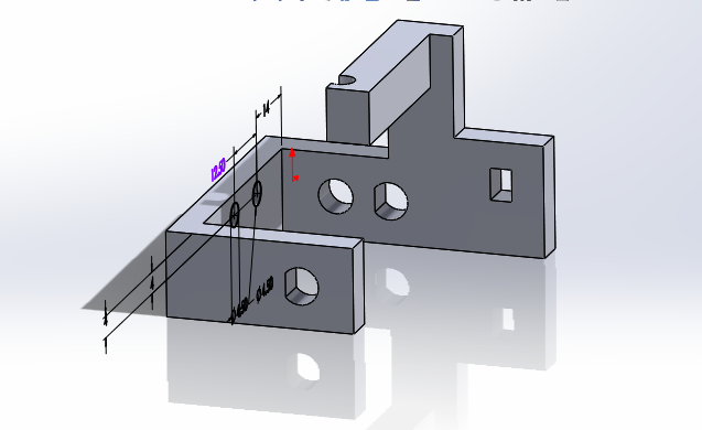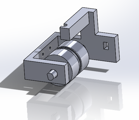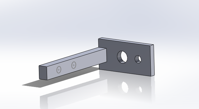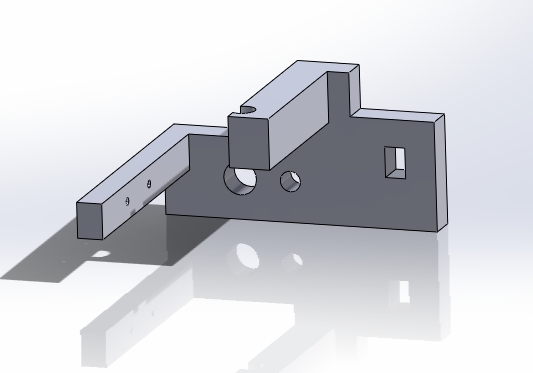 The two holes with “+” marks show where the sensor will be attached. The large circular hole is to be attached to the printer. The small hole is for the axis which will hold the wheel that touches the filament. From here we designed a housing for the sensor that incorporated both designs. By combining the designs, the final part is stiffer (therefore more stable on the printer) and can be mounted on the print head precisely. The following is that model: