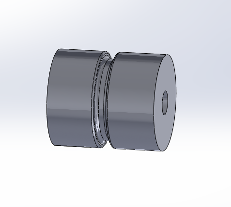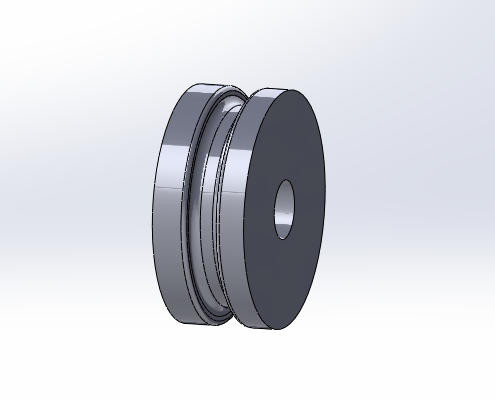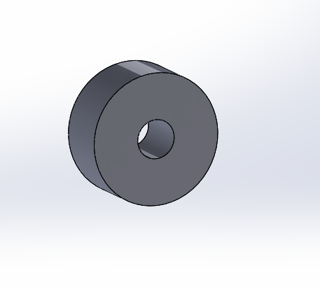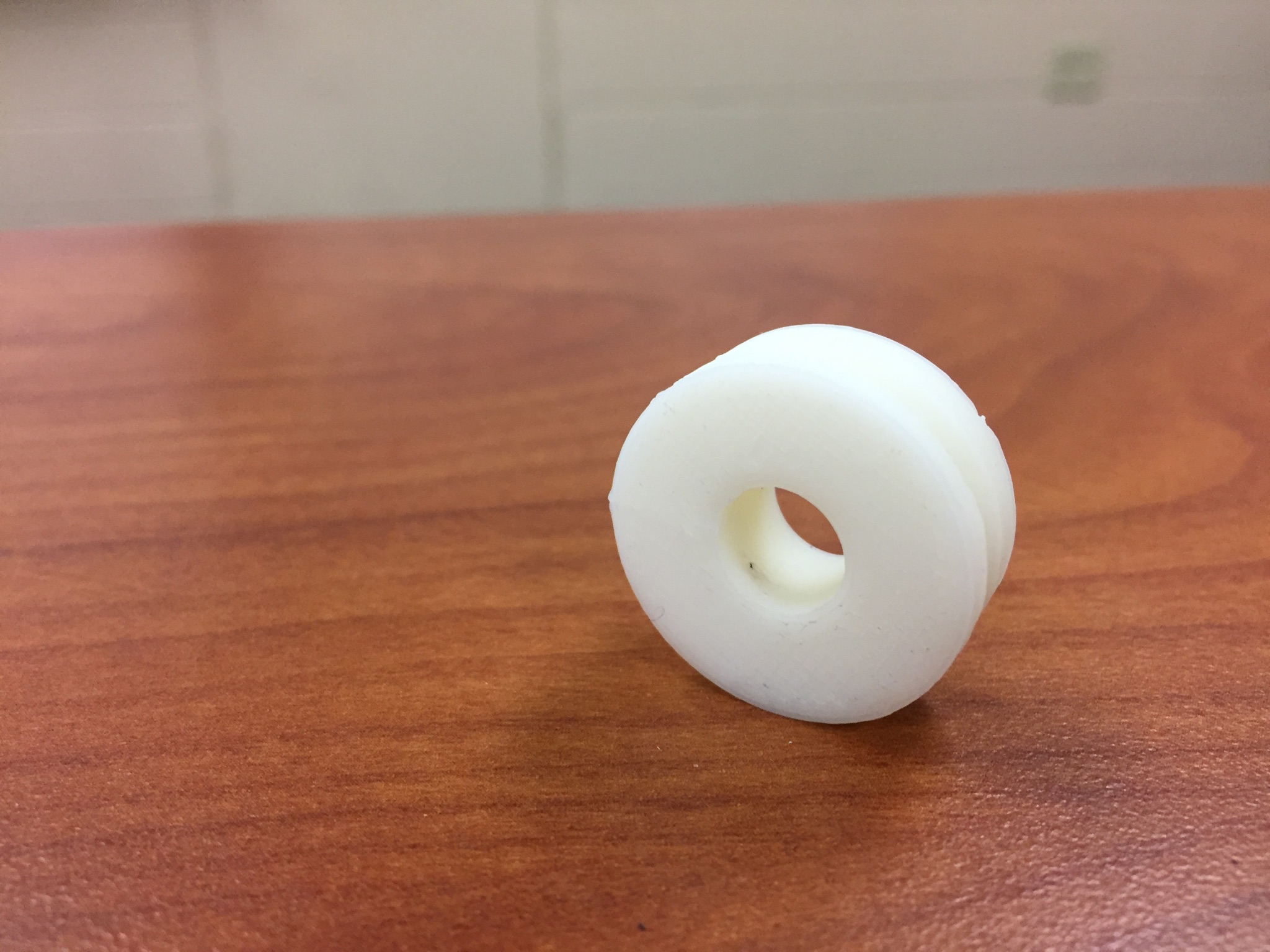 Before we printed this wheel however, we noticed it should have a channel in the middle to allow for the filament to pass through. This would aid in guiding the filament as well as turning the wheel due to an increased contact surface area. This led to our next design, which we felt was ready for printing. We printed the following wheel design and our complete housing design with 3mm PLA filament in the FDM Lulzbot Taz5 printer, using Cura software.