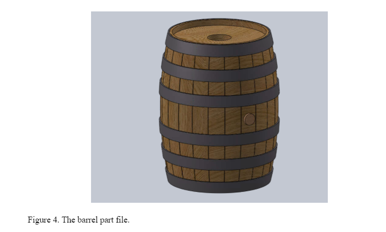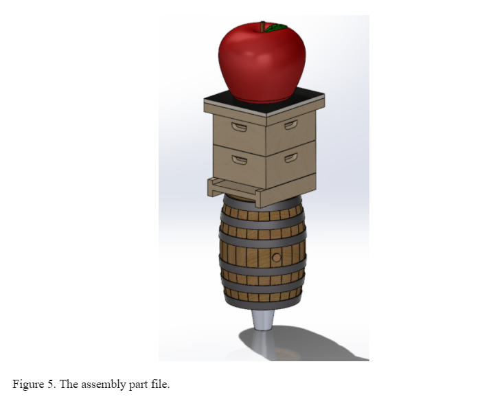 Meeting with Walker and brainstorming ideas has generated our initial design: a stack of three fundamental symbols: the apple, the Langstroth beehive, and the whiskey barrel seen in Figure 1. The apple and hive symbols are essential because while a cidery owner, Walker is also an Orchard Manager at Eplegaarden in Fitchburg, WI. He respects local agriculture and therefore uses locally sourced apples and honey. The barrel is significant as he is partnered with Old Sugar Distillery in Madison, WI where he gets the barrels for aging. The part files for the three symbols and core are included in Figures 2-5.