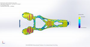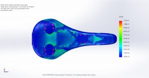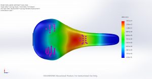 To maximize the performance of the bike saddle, we must both reduce the saddle weight and increase the saddle strength by intentionally implementing carbon fiber composite into our design. Through stress analysis of our SolidWorks model, we were able to identify the model’s high stress locations as seen in Figure 4.