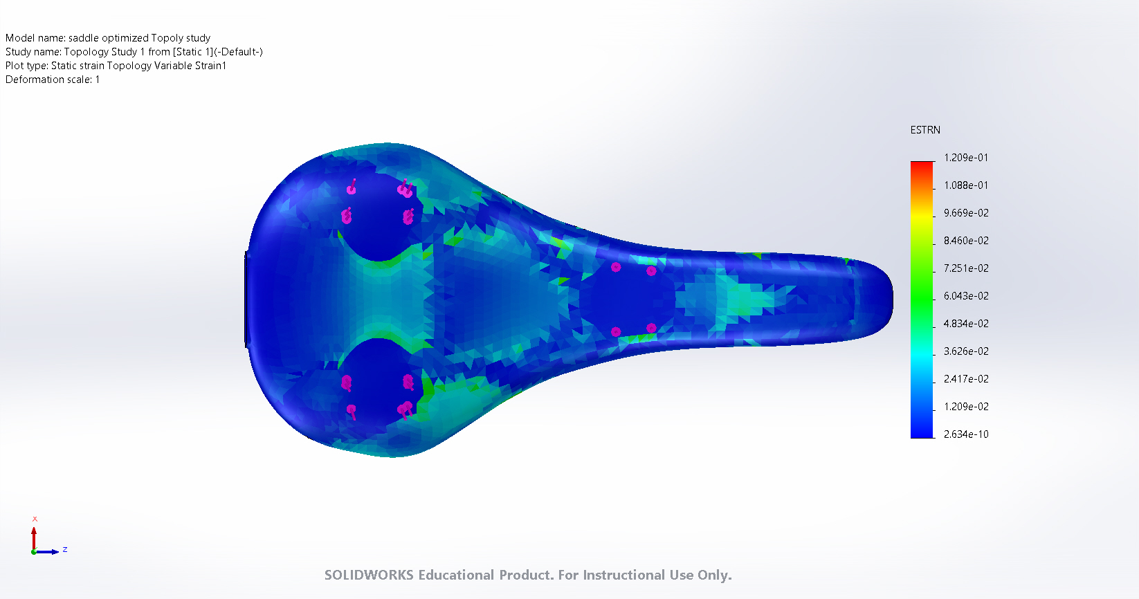 The combination of riding in these two positions leads to load points seen in our analysis in Figure 2, denoted by purple dots/arrows. Thus, when it came to testing the saddle model, these were the load points that were used. With the load points determined, the FEA was performed. In the below figures are laid out diagrams of how one particular bike saddle performed under load.
