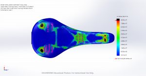 Figure 2 details how the bike seat deflected while subjected to the load conditions. As seen in the figure, the highest deflection occurred at the transition from the narrow to wide end of the seat. Given that this portion of the saddle has no reinforcement under it in the form of metal rails like the other ends have, it makes sense that the highest deflection is seen in this region. This high deflection can lead to potential failure in a bike seat. To make it less likely to fail under any given load, carbon fiber composite will be implemented.