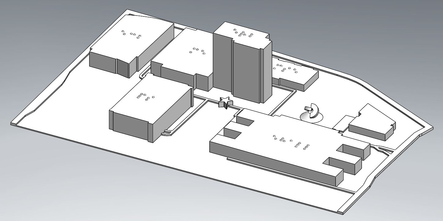 For our initial design we used the UW-Campus map to create a 2-D layout of the engineering campus. This is parametrically modeled in SolidWorks allowing for quick adjustments to build height and scaling as needed based on manufacturing and usability feedback we receive. The primary paths around the campus are modeled as raised platforms from the base to allow for identification of the local path you are on within the set of buildings. Surrounding roads are also mapped and extruded. Each Engineering campus building has an identifying acronym labeled on its top surface in Braille according to Braille reference data [1]. Additional Tactile Navigation map symbols and map features can be added according to recommendations made by the Journal of Blindness Innovation and Research after initial runs are completed [2].
