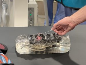 Lumbar spine injections are a fairly common, low-risk procedure used as a pain management technique. The current standard for teaching lumbar spine procedures involves having residents and fellows immediately perform procedures on patients without hand-on practice in a simulated environment [1]. Simulation devices have recently become a viable alternative to train individuals, allowing them to build skills for more complex injections. Simulation devices allow new physicians to become comfortable with the procedure without the risk of learning on patients. These devices typically replicate the lumbar region of the body. Many contain a replica spine, replica cerebrospinal fluid, and replica tissue, as well as circuitry to power various components of the device. However, these devices are expensive, ranging in cost from 1000 to 5000 dollars [2, 3]. Additionally, most current models fail to replicate alternative spinal pathologies, such as scoliosis, which limit their function as an educational tool. Significant improvements can be made to lumbar injection models to reduce their cost and increase the simulated variability in the educational procedure.? In previous semesters, multiple prototypes have been produced including that of a “normal” lumbar region as well as a scoliotic model.