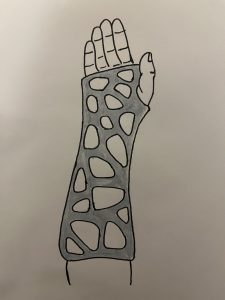 – Preliminary designs and manufacturing considerations: We must ensure that our design allows for the cast to be breathable and must endure any potential stresses or strains that may occur. Two of the largest manufacturing considerations that come to mind revolve around the biocompatibility of the material used in the print, along with the rigidity of the material which must be considered so that healing properly occurs in the patient. We have an initial drawing attached below, we are considering optimizing the design of currently marketed 3D printed casts: