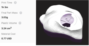 The print orientation was selected so that no support structures attach to the surface in contact with the ear. The shortest layer thickness of 50 micron was used, to enhance details and to improve surface quality. The part took about three hours to print, one hour of post processing to remove support structures, and cost about two dollars.
