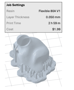 The second additive manufacturing method used to create the AirPods sleeve was Stereolithography (SLA). SLA involves using an ultraviolet (UV) laser to selectively cure and solidify a liquid resin contained in a vat. The team decided to pursue this method as it provided several advantages over FDM and would hopefully overcome the problems experienced in the initial print. First, SLA parts have a high-quality surface finish and layer lines are far less visible. Second, SLA printers have a much wider variety of available materials with different material properties, such as flexible and elastic resins. Finally, SLA provides a high degree of resolution and print accuracy, meaning it can achieve fine details in the final part geometry. The sleeve was printed on the Formlabs Form 3 printer, using Flexible 80A V1 resin. The print settings are described in Figure 2.