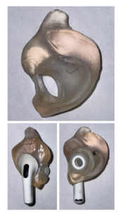This project is focused on the design and fabrication of a personalized sleeve for Apple AirPod Pros, aimed at improving comfort and fit by aligning closely with the unique contours of the user’s ear. Given the widespread popularity of AirPods across diverse user demographics, it is challenging to achieve a one-size-fits-all design that accommodates the varied ear shapes of all users. Furthermore, standard AirPods often become loose or dislodge during physical activities such as running or exercising. This project addresses these issues by developing a product that functions as an adaptive accessory for AirPods, attaching directly to the device. The sleeve is tailored to individual ear contours and produced using additive manufacturing techniques. The project employs two primary additive manufacturing methods: Fused Deposition Modeling (FDM) and Stereolithography (SLA), along with an indirect manufacturing approach through silicone molding. This report evaluates the comparative effectiveness of these techniques in terms of comfort, stability, and sound isolation. Experimental results indicate that sleeves fabricated using SLA and silicone molding exhibit comparable performance, particularly in aspects of stability and sound isolation.