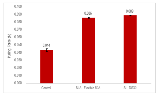 A thin rope was tightly secured around the AirPod, AirPod with 3D-printed sleeve prepared by SLA, and AirPod with silicon sleeve prepared by indirect manufacturing. Incremental mass, denoted as m2, was gradually added to the opposite end of the rope. As the weight increased, reaching a critical point, both sleeved and unsleeved AirPods were dislodged from the ear canal. Figure 10 shows the improved stability of the suggested sleeve solutions within the ear.