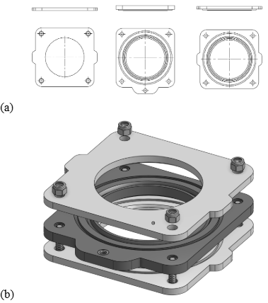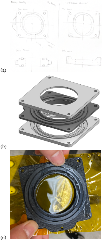 The first iteration of the new design still experienced leakage, necessitating further improvements. In the second iteration, a clamping mechanism using screws, watertight nuts, and a 3D-printed seal was introduced to address this issue. This design features a circular window and two rings that both seal the vat and apply distributed force around the plastic film to maintain tension and prevent wrinkling (figure 3). While this version was nearly watertight, issues with part tolerances emerged. Specifically, the bottom and middle components did not fit properly due to dimensional inaccuracies between the 3D-printed rings. Additionally, the orientation of the bottom part during printing proved critical; if the concave rings faced the print bed, heat-induced expansion caused deformation, preventing a proper fit within the middle cavity. It was also discovered that the thickness of the film prevented the two parts from joining fully.