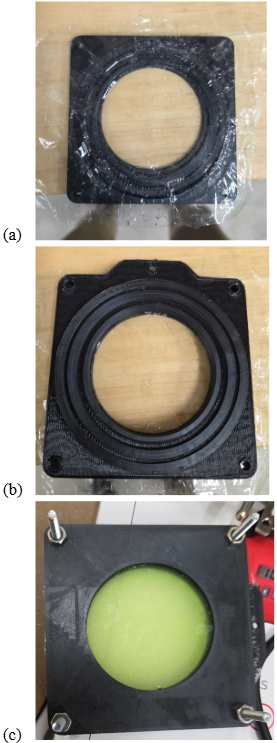 The original ink vat design proved inadequate, primarily due to issues with assembly. It was prone to leakage because the glue failed to form a proper seal, the assembly process was time-consuming, and the film often appeared wrinkled as presented in figure 1. To address these issues, the redesigned vat focused on eliminating these shortcomings. The new design aimed to be watertight, heat resistant, and capable of maintaining high transmittance for focused ultrasound, ensuring improved functionality and reliability.