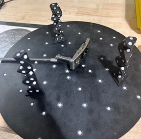 The first design process utilized 3D scanning technology at the UW-Madison Makerspace. The team used a Creaform HandyScan 700 to render a solid model of an Odyssey Toulon – San Diego blade putter head. Due to the geometry of the putter head, two separate scans were required that were then merged into one solid mesh using Creaform’s VX-Elements. The scanning setup and VX-Element software are shown in Figure 1 and Figure 2, respectively.
