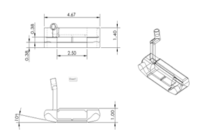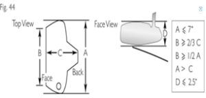 The second design process utilized parametric modeling through SOLIDWORKS. The basis for the design was the same Odyssey Toulon – San Diego blade butter but certain liberties were taken for design freedom. The primary constraints on overall size including length, width, and depth were based on governing USGA regulations shown in Figure 4. The critical dimensions for the model are shown in Figure 5 and the initial 3D model is shown in Figure 6. The initial design had a continuous solid body with the hosel directed connected to the top face. As described later in the report, this design was modified to improve printability and aesthetics.