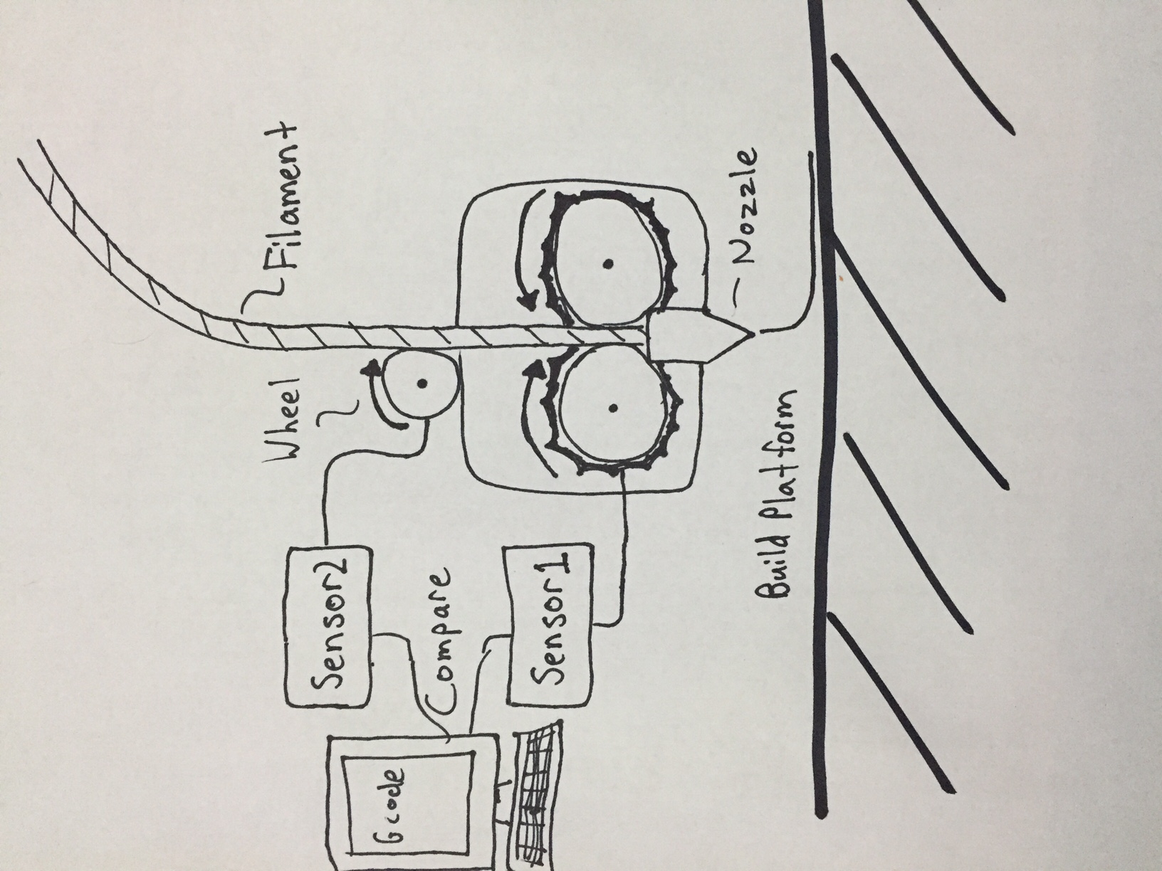 The following schematic shows a possibility for detecting the filament error. A rotational sensor connects to a wheel in contact with the filament (in a different position than the feeder) and another sensor connects to the extruder feeding motors. The signals from both sensors are compared and if one is not moving, some software identifies this as an error and sends a signal to the printing software to stop and recognize the current G-code line. The signals can be read using Arduino sensors and accompanying computer software. As for recognizing the line of G-code, software must be researched that provides the real time G-code. From there, we can setup a screenshot or video system that records the real time G-code and therefore catches the G-code line when the print stops.