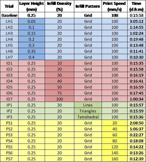 The purpose of this post is to examine the various 3D printer parameters and how they affect the print time. Since the track is a large part that uses over 150 grams of material, reducing the print time is essential. However, we do not want to sacrifice the function or quality of the track, thus we will have to find the right balance of speed and quality. We opened the track in Cura and varied numerous parameters to determine the sensitivity of each. We decided to examine the layer height, infill density, infill pattern, and print speed since these are some of the most important parameters with regards to speed and quality. The part can only be printed in one direction, thus the orientation will not be examined. We printed our initial prototype of the track which took over 15 hours. While the settings used to print the prototype will be described in more detail in the future, we wanted to make a quick note of what was used. An Ultimaker 3 was used to print our track prototype using turquoise PLA. Additionally, the print parameters used were a layer height of 0.25 mm, an infill density of 20%, a grid infill pattern, and a print speed of 100 mm/s. Since this part was already completed, we will use these values as the baseline. The rest of the sensitivity results are summarized in Table 1.